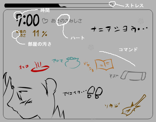 イベントが終わると、 主人公は会社に行きます。 土曜日まで会社で働いて、 日曜日にやっと休日です。 休日ではコマンドを使用して、 ストレスを減らし、彼に会いに行くことが出来ます。 コマンドと部屋の汚さとハートは、 密接な関係があります。 ハートとコマンドの組み合わせによって 「コマンドコンボ」が生じ、 大幅にストレスを減らせます。 ですが、部屋が汚くてコマンドの効き目が薄れたり、 ハートとコマンドの組み合わせが悪くて、 逆にストレスを溜めることもあります。
