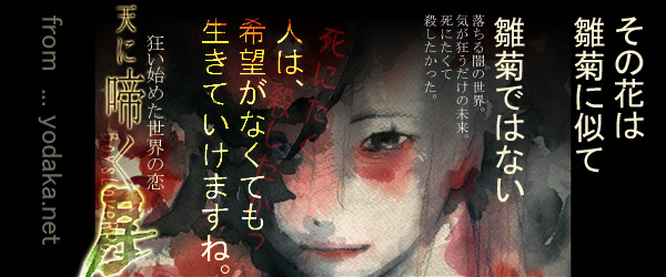 : : : この世界に生きる人は ふたつばかり、道がある。 表と、裏の 道がある。 表の顔は変わらない 現世現実変わらない 普通の職業 普通の人生 裏へもぐるは 禍々しき人 理由なければ もぐれない : : : 世界の光のした。 見つかってもう何年も経った、 巨大な、地下山脈、地下道。 「誰」が作り、 「誰」が歩んだのか… 世界の下の、大きな迷道。 そこは魔と人が行き来する この世にてこの世でない世界。 生と死ならば 死が近い。 もぐれば 狂気が肌に触れる。 目は意味を成さない 力は意味を成さない 頼りになるのは 己の心と 己の想い : : : 地下山脈、湖のほとり、 苔むした岩岩の音 それでも埋まる「たから」を求め 欲深い人は潜り続けた 人を雇うか 己が潜るか… : : : あまたもの 屍ばかりが 増えていった 地下大迷路 その名は「天」。 それに潜る人間を、 「地下ヒト」と呼ぶ。 : : :