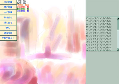 ●スタート地点は家です。 家にいると、「調合」したり「休ん」だり、 他のところへいったりすることができます。 なにはともあれこのゲームでは お金が一番大事になってきますので、 お金を稼ぐためにも調合調合。 →こっちがわの、3つのボックスの 真中が調合の「元」のすらいむボックスです この中から1つすらいむをくりっくして、 「調合登録」を押すと、 すらいむを一番上のボックス、「なべ」にいれることができます。 「なべ」には5つまで、すらいむを入れることができます。 すらいむをいれたら、「調合」を押してみてください。 一番下のボックスに、調合されたものが追加されます。 気力が低いと失敗することもあります。 気力は、「休む」を選択して回復しましょう。 調合の元(すらいむ)は「外に出る」を選択したときに、 つかまえることができます。
