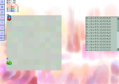 ●外に出ると戦闘が始まります。 「炎」は気力を消費して、攻撃球をだすことが、 「草」は気力を消費して、一定時間「時」をとめることが、 「水」は体力を消費して、気力を回復することが、できます。 それぞれ、自分のステータスが高くなければ へなちょこです。 「やじるし」で一コマずつ、移動することができます。 かったるいやね。 「帰る」で家に帰れます。 運良くすらいむを倒せたら、 「調合元」を手に入れることができます。